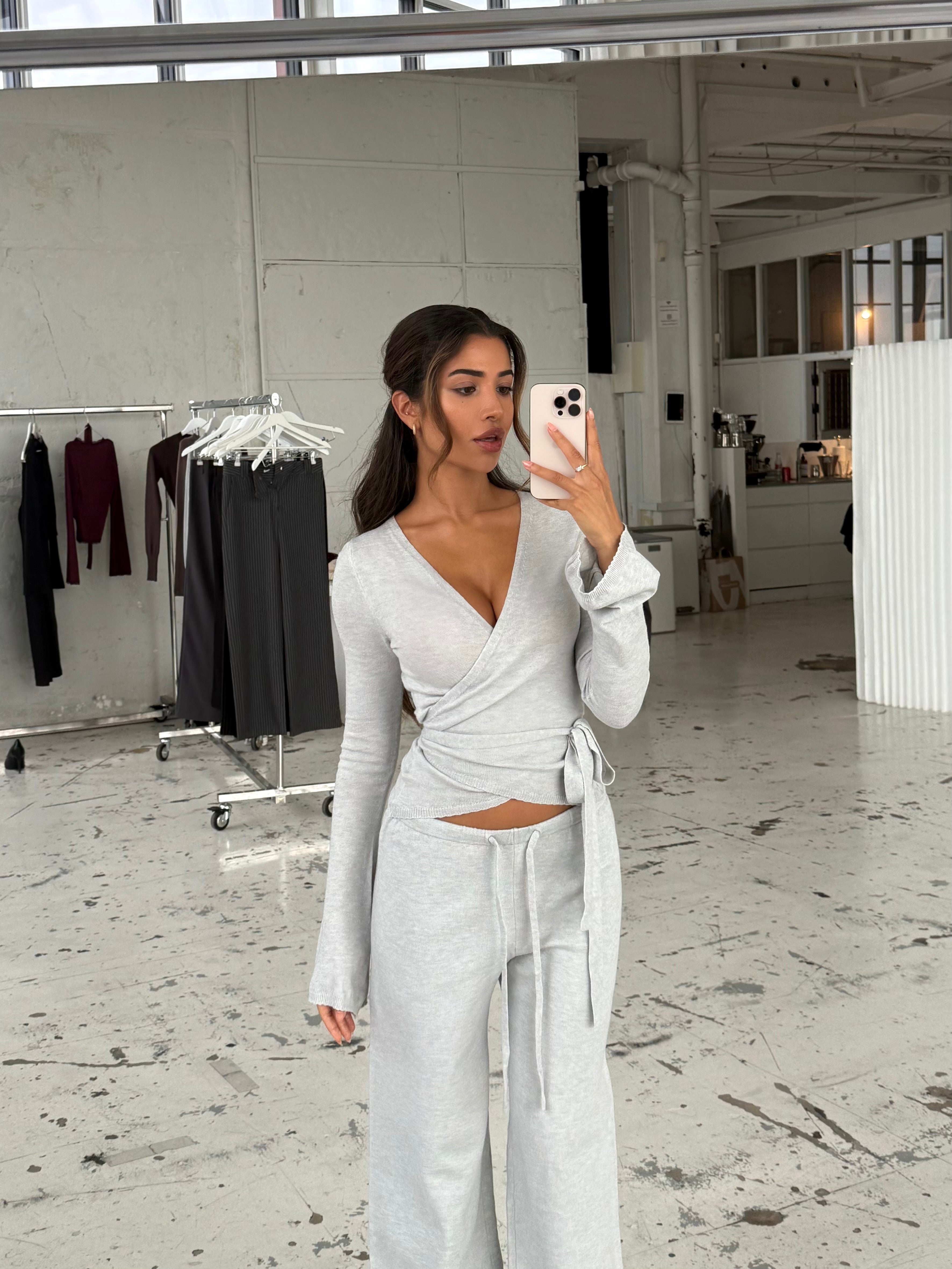 Vakker wrap-topp i det mykeste strikket stoff med ull. Toppen har mye stretch, som sitter flott til kroppen. Toppen har lange ermer og en dyp utringning.