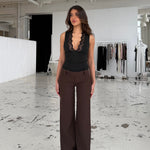 Dressbukser med lav midje og vide bukseben som sitter pent på kroppen. Buksene har knapper i midjen og som lukking. De er sydd i et behagelig materiale, noe som gjør dem komfortable å ha på, samtidig som de sitter fint.