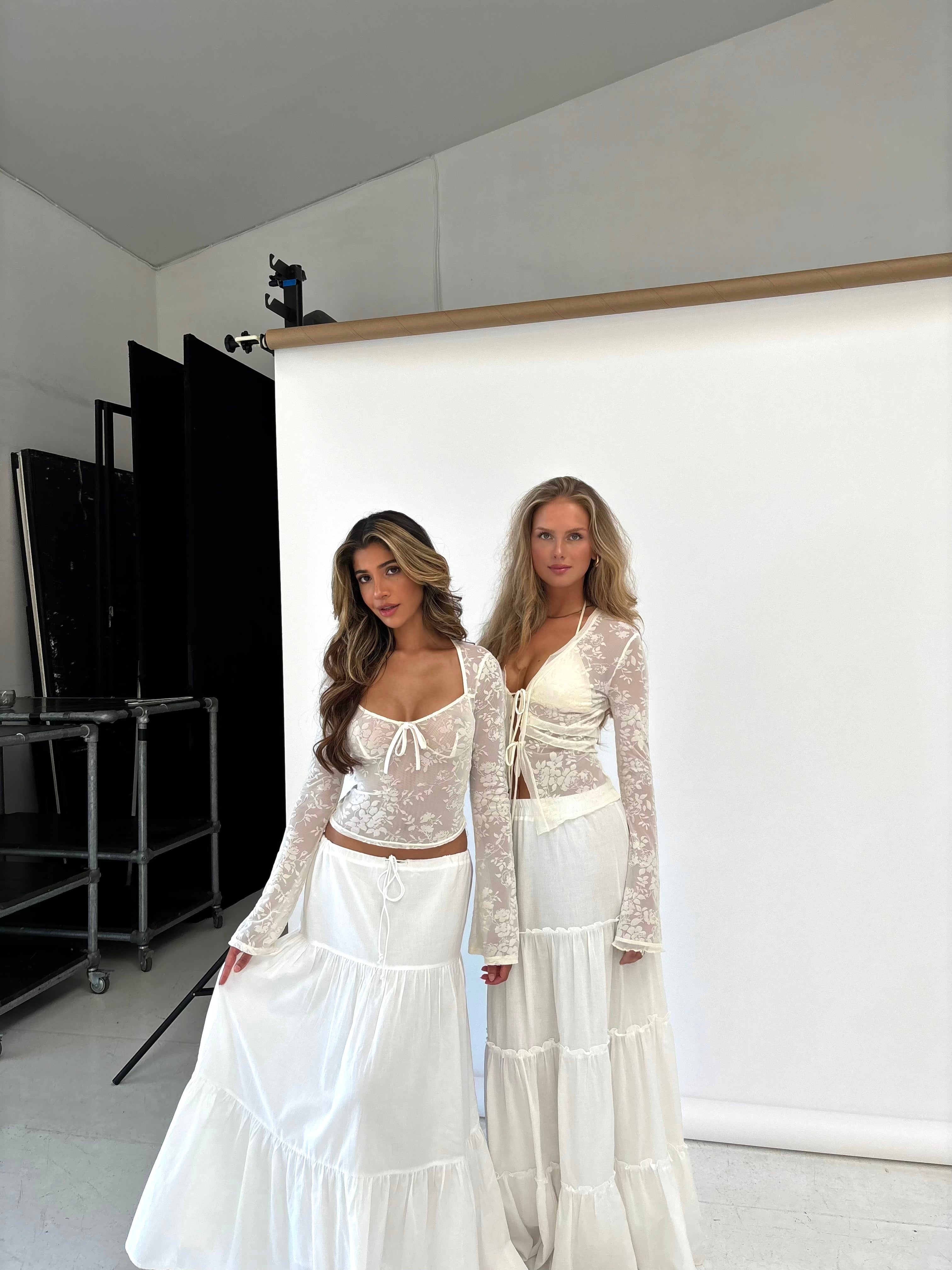 Vakker kremtopp i mesh med knyting og lange ermer. Toppen er laget av et mykt meshstoff som er veldig behagelig å ha på.