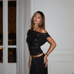 Vakker blondetopp med rosemotiv. Sitter flott på kroppen. Den kan styles på ulike måter, både off shoulder og one shoulder.