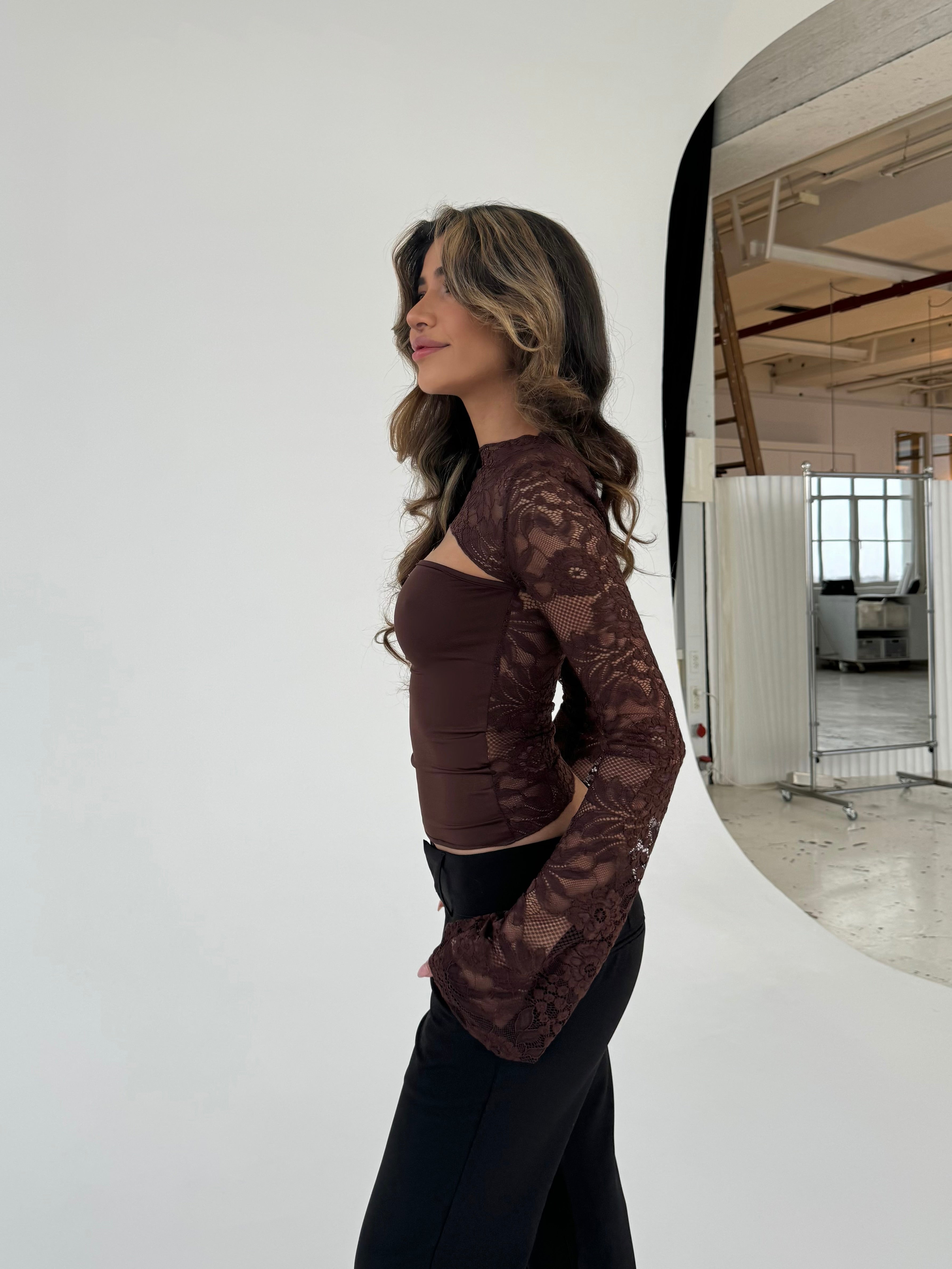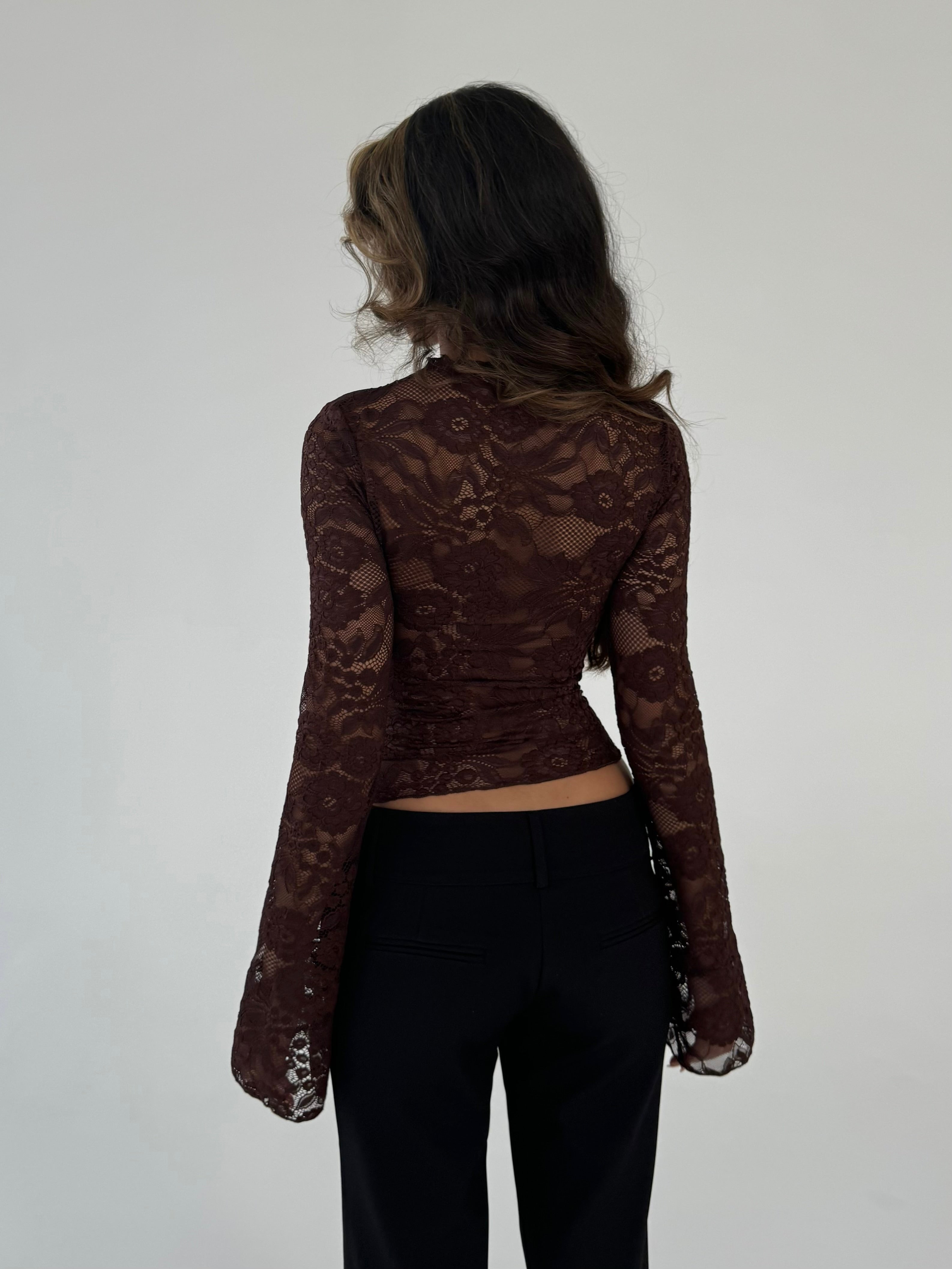 Vakker blond topp i materiale med veldig strekk som sitter fint til kroppen. Toppen har lange ermer med blond over så vel som hele ryggen.