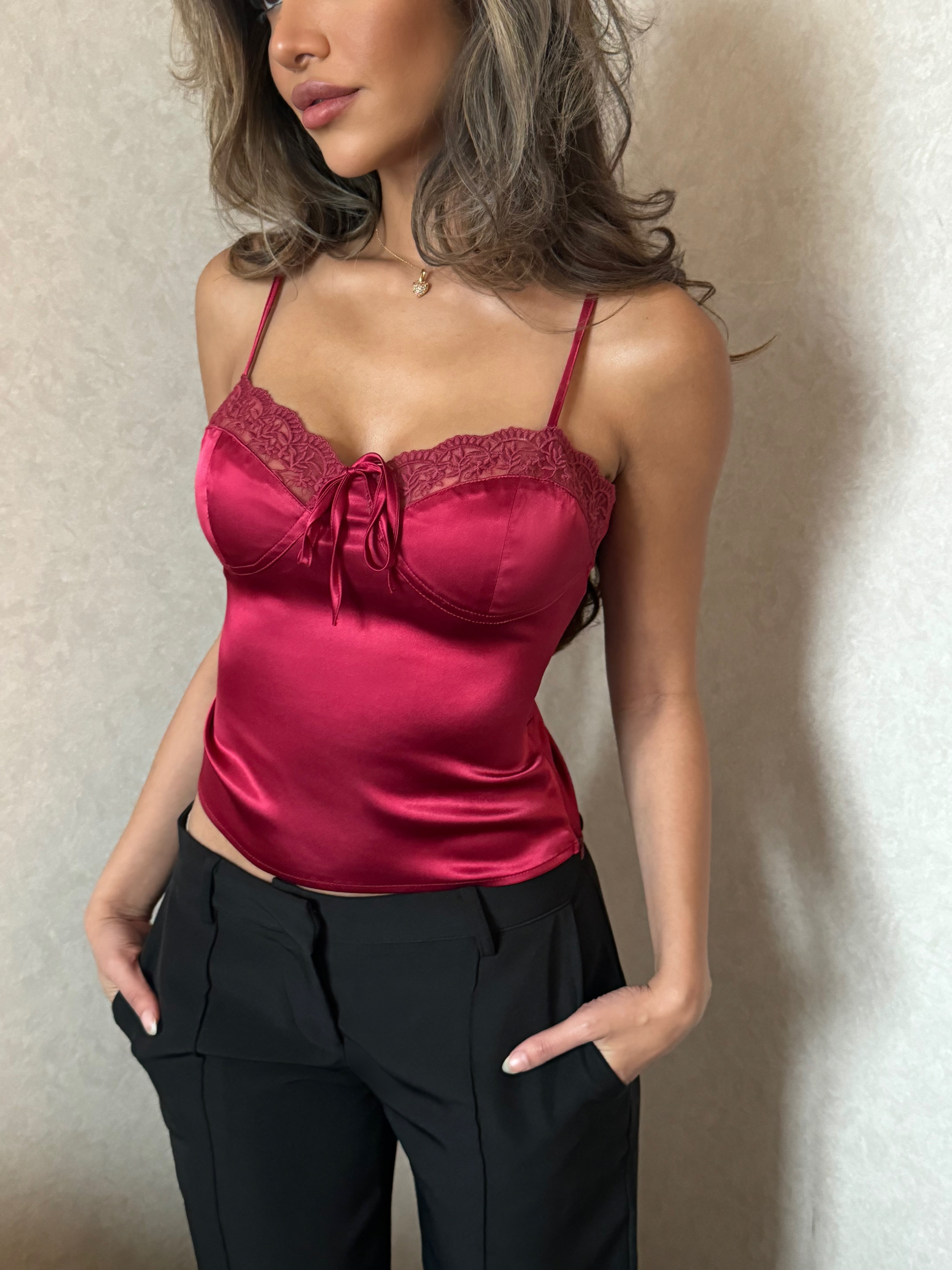 Sateng topp med blonderkanten i det mykeste materialet. Toppen har strekker seg og sitter vakkert til kroppen. Det er en glidelås i siden. Toppen har sømmer under bysten for å gi et corsage-utseende, men har ikke bøyle.