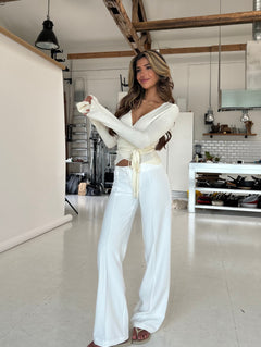 Cardigan i det mykeste materialet, laget av ullblanding. Den knytes i siden og kan strammes etter ønske.