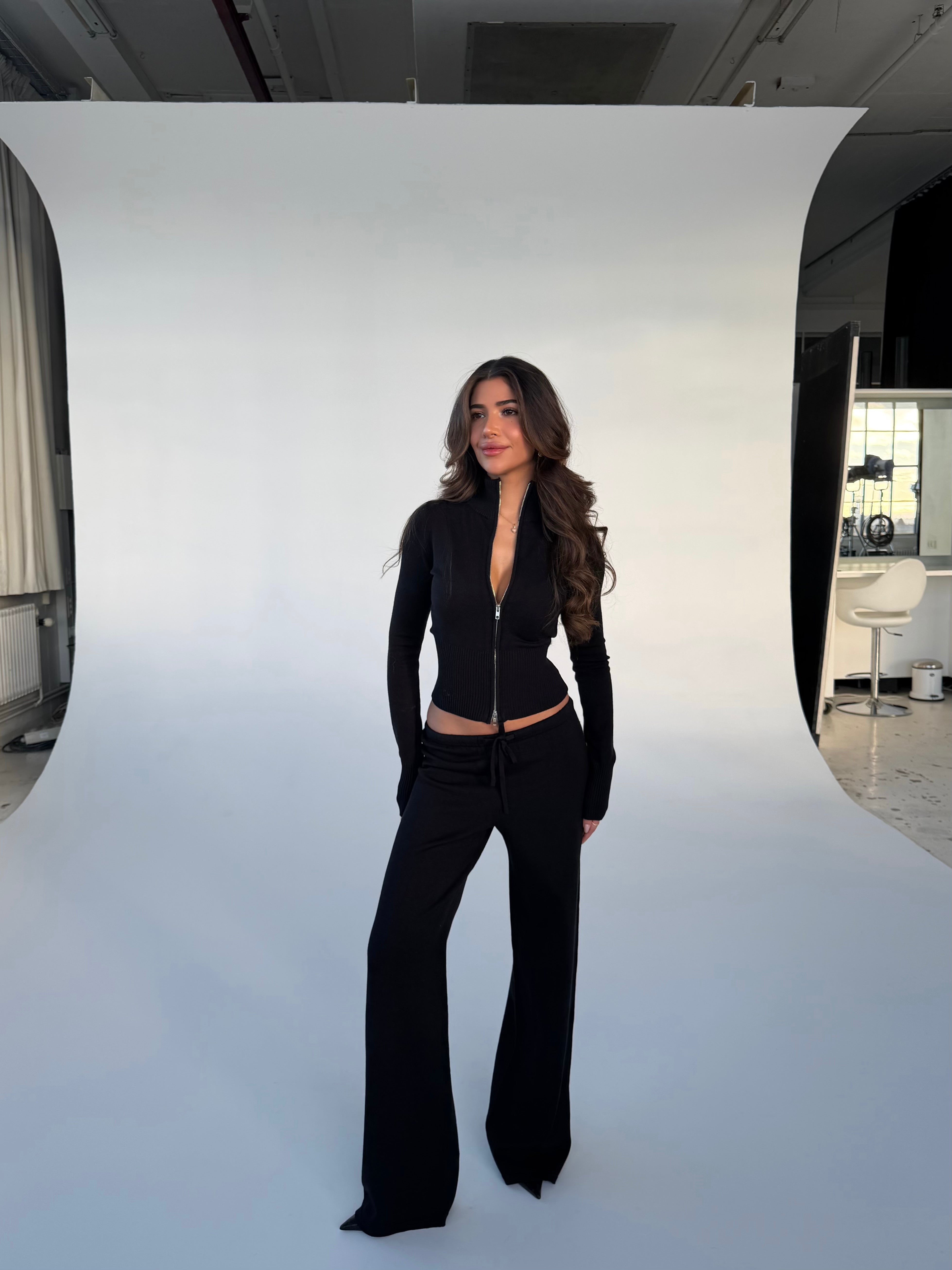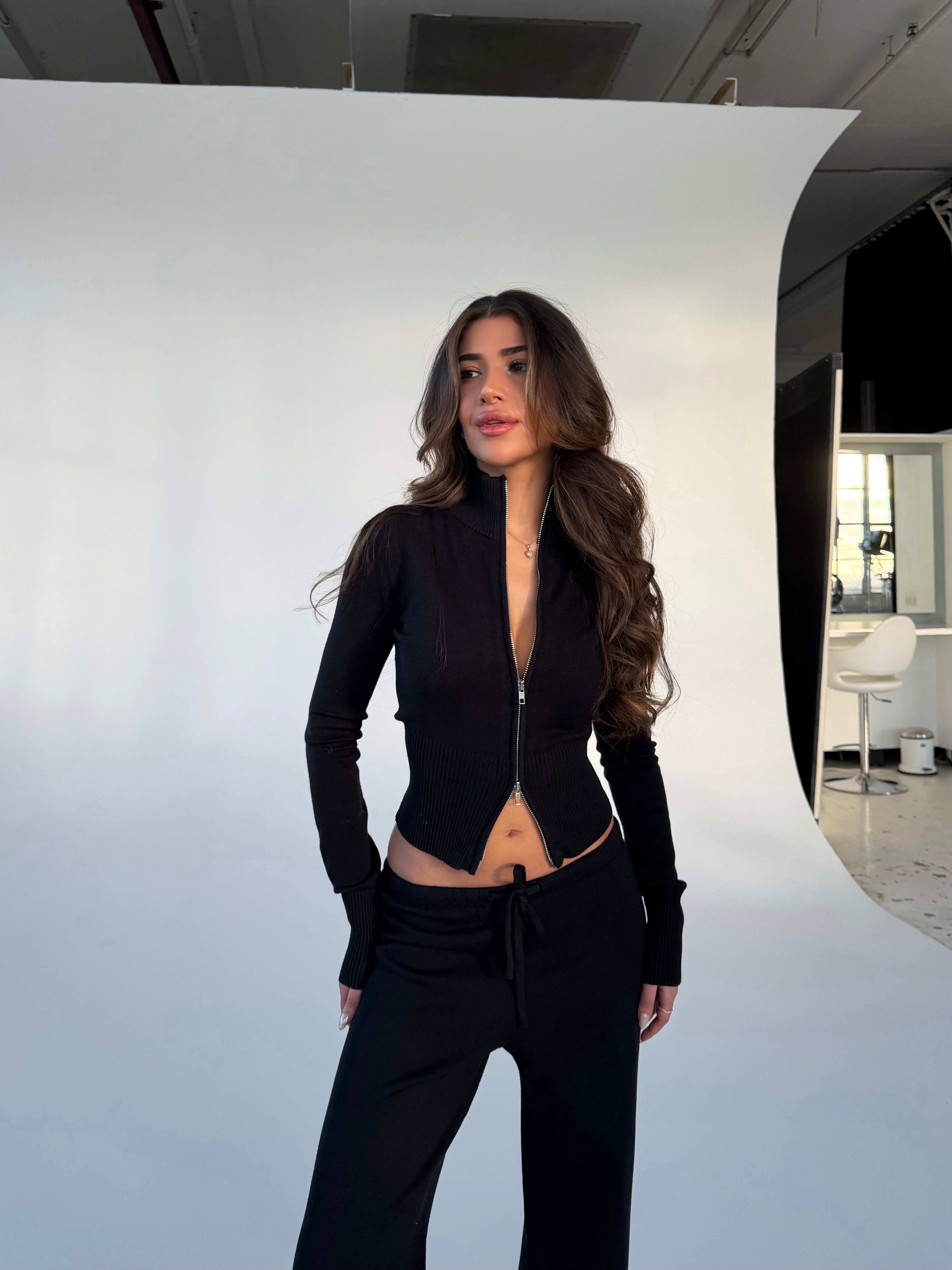 Glidelåsstrikk i det mykeste materialet, laget av en ullblanding. Den sitter fint på kroppen og kan glidelåses både fra toppen og nedenfra.